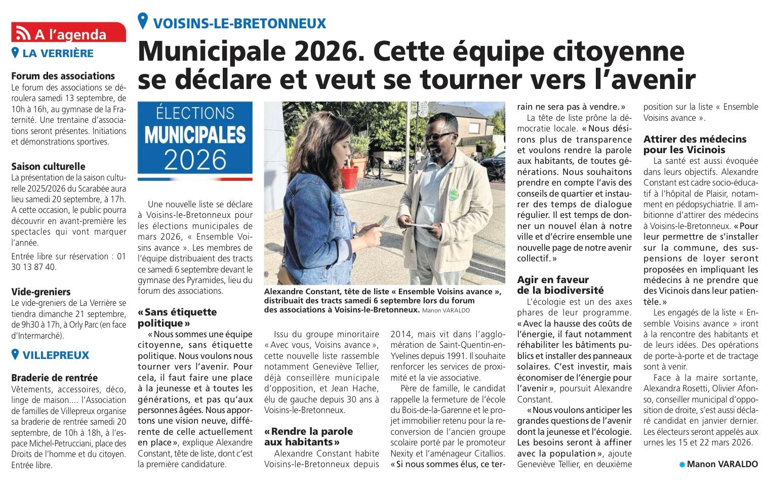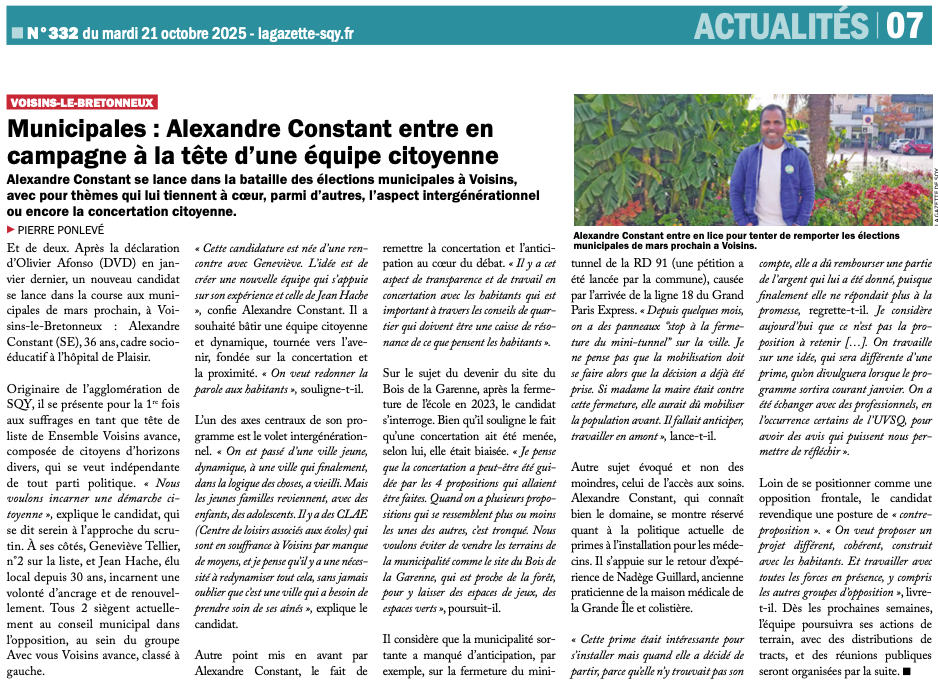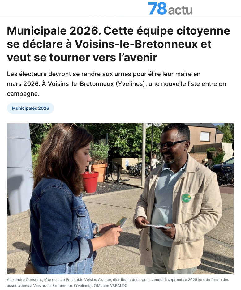 Une équipe citoyenne, intergénérationnelle et dynamique se lance dans la course aux élections municipales de 2026 pour répondre aux besoins d’aujourd’hui et relever les défis de demain. Issue du groupe d’opposition « Avec vous, Voisins Avance », cette nouvelle liste rassemble, autour de l’expérience de Jean Hache et Geneviève Tellier (déjà conseillers municipaux), de nouveaux habitants issus de tous les quartiers, porteurs d’une vision d’avenir différente de celle actuellement en place. Face à deux candidats déjà déclarés et engagés dans un duel sur les réseaux sociaux, notre liste refuse la logique du face-à-face imposé. « Limiter le choix des électeurs à un duel appauvrit la démocratie, alimente le désintérêt et l’abstention. Nous voulons au contraire favoriser le débat, la nuance et la tolérance », explique Alexandre Constant, tête de liste associée en binôme à Geneviève Tellier. Nous proposons une démarche profondément participative, où chaque habitant est acteur des décisions à venir. La liste "Ensemble, Voisins Avance" s’articule autour de valeurs fortes et de priorités claires